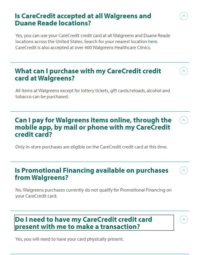 You can also find help for many potential issues online here. Qualified health wellness and personal care items will be charged to your card. Yes you can use your CareCredit credit card at all Walgreens and Duane Reade locations across the United States.